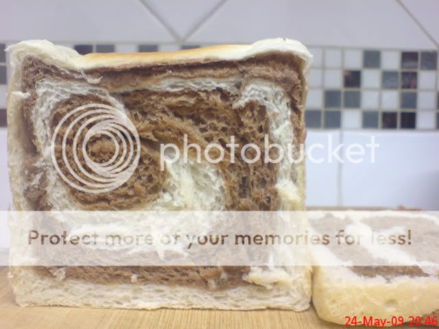 用回高粉做的双色土司,我的信心才回来了(之前做了失败的奶香土司后,我的信心都被打沉了)用了钮扣型的巧可力,味道非常浓.自己试吃一片而已,剩下的都拿了回妈妈家.大侄女吃了一直说好吃,听了满开心的.