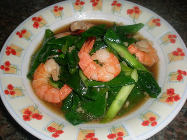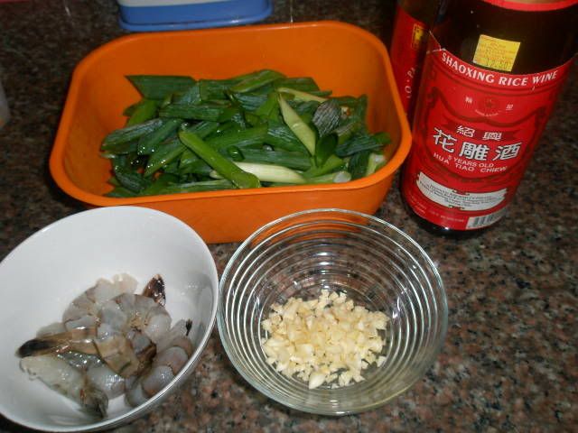 1. 爆香蒜米和虾,再放入蒜和调味料炒一炒