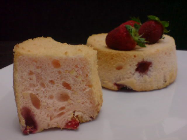 草莓优格奶戚风蛋糕 放了新鲜的草莓 不过假厉害 因为怕草莓沉底 , 沾了面粉的草莓 最后才放进面糊中 所以草莓都没有融进面糊里, 全部浮在面糊上