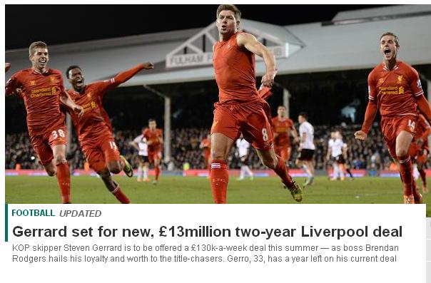 英国《太阳报》爆料,利物浦将在今年夏天同队长杰拉德续约2年,红军忠魂新合同的周薪将是13万英镑。