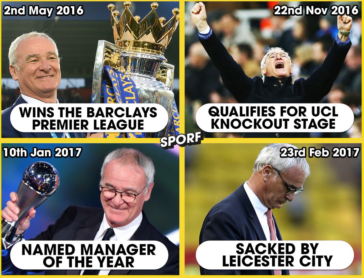 北京时间2月24日凌晨,英超莱斯特城俱乐部宣布主教练拉涅利下课。就在九个月前,拉涅利刚带队力压群雄夺得英超联赛冠军。