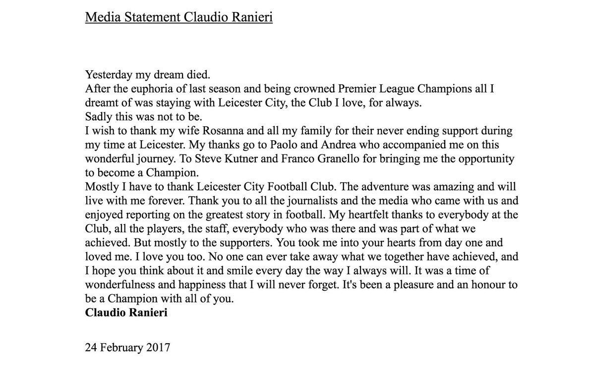 俱乐部副主席艾亚瓦特表示:“这是我们自从王权集团收购莱斯特7年来最艰难的决定。克劳迪奥带给过我们出色的成绩,我们都知道他的执教和对于球队的鼓励给球队带来非常有价值的经验。他的温暖、魅力和个性也潜移默化的让俱乐部有所发展。我们对他给球队带来的成绩永远感激。我们没有想过上个赛季如此出色的成绩本赛季必须要复制,事实上,在英超保级才是我们最重要和赛季初始的唯一目标。但我们现在为了达成这一目标还需要努力,所以我们认为对最后13场比赛来说,必须要有所改变才能达成这个目标。”