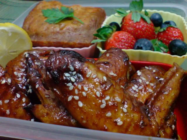 烤鸡翅膀我喜欢 。。草莓我最爱 。。。请问美美的便当左上角那一块是什么啊?甜点? |