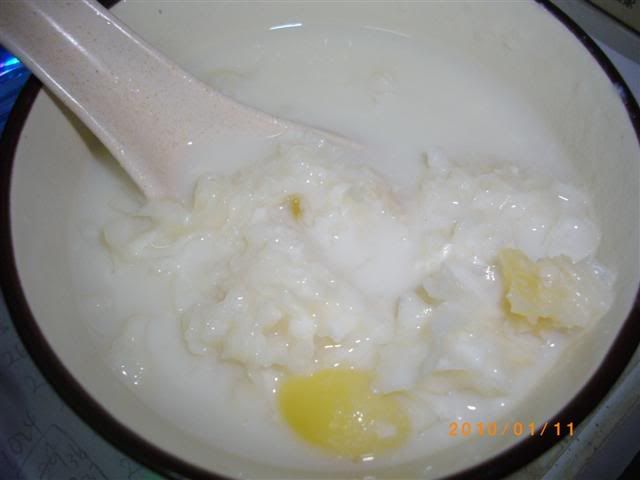 这甜品的点子来源是pityoon和我在一家酒楼吃到的甜品~pityoon的是豆奶炖雪蛤和白果~酒楼吃到的是雪耳白果炖奶露~我不知道酒楼的是不是用豆奶~我只是试着用豆奶炖雪耳白果~然后再加牛奶,就成了这道甜品~吃剩的放入冰箱后再吃,更好吃~