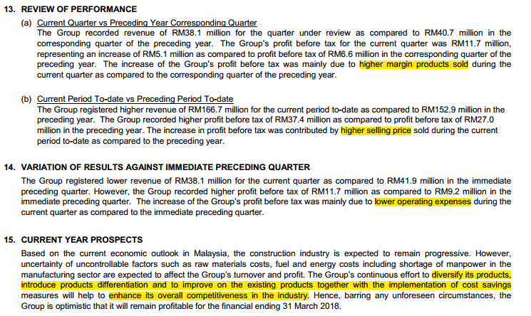 | | | Current Year Quarter | Preceding Year Corresponding Quarter | Current Year to Date | Preceding Year Corresponding Period | | | 31/12/2017 | 31/12/2016 | 31/12/2017 | 31/12/2016 | | | RM '000 | RM '000 | RM '000 | RM '000 | | 1 | Revenue | 36,505 | 41,858 | 107,589 | 128,618 | | 2 | Profit/Loss Before Tax | 6,001 | 9,225 | 21,740 | 25,673 | | 3 | Profit/(loss) attributable to ordinary equity holders of the parent | 5,404 | 7,030 | 17,111 | 18,551 | | 4 | Net Profit/Loss For The Period | 5,404 | 7,030 | 17,111 | 18,551 | | 5 | Basic Earnings/Loss Per Shares (sen) | 3.30 | 4.41 | 10.46 | 11.64 | | 6 | Dividend Per Share (sen) | 2.00 | 2.00 | 2.00 | 2.00 | | | | | As At End of Current Quarter | As At Preceding Financial Year End | | 7 | Net Assets Per Share (RM) | | | 1.0000 | 0.9500 |