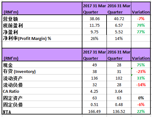 从年度业绩有一个发现,那就是该公司自2010年至今,无论在营业额和净利都已经连续7年取得增长(注:2016年营业额稍微下跌),这确实是一个相当骄人的纪录。