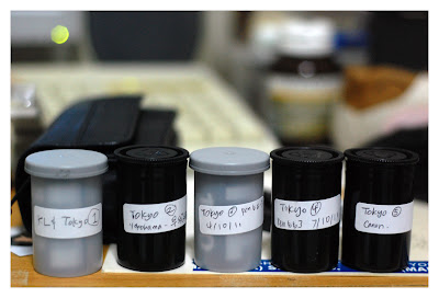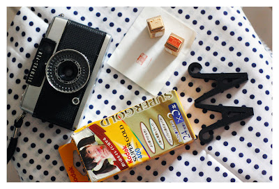 (顺时左起) Olympus Pen EE-3 from flea market in Meiji Kouen for only 1000yen; rubber stamps of EE-3 and Diana F, 473yen each from Popeye Camera; clips from Popeye Camera, 126yen each; and Kodak Super Gold 400 (3x24) for 680yen, from Kitamura.