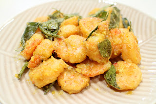 做法1:虾放进油锅中炸至熟,捞起沥干油分。(正确做法是把整只虾,连壳一起炸。 可是我买的虾是去了壳的,所以..)