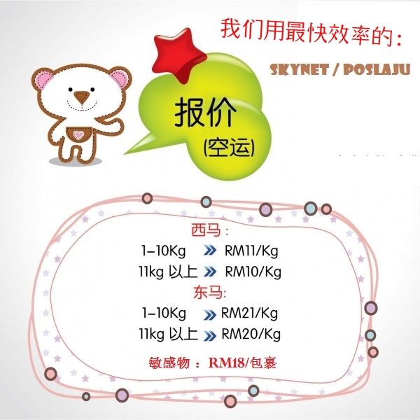西马(SKYNET / POSLAJU) : 1-10kg RM11.00/kg ,10.1kg以上 RM10.00/kg 敏感物:RM18/包裹