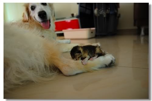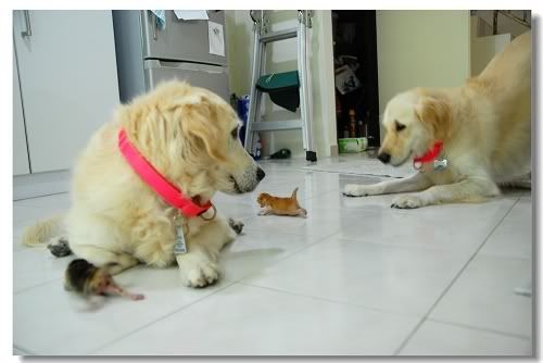 不懂咱們家的會一樣嗎? 我只知道牠們看到貓就像看到仇人似的.. 甚至你跟牠說: 瞄瞄呢.. 瞄瞄在那裡? 牠們竟然會去找... 看看平時貓貓出沒的地方有沒有...  |