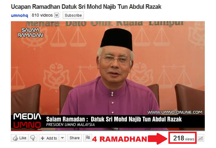 Sungguh memalukan, itulah perkataan yang boleh dihuraikan tatkala melihat video ucapan sempena Ramadhan Perdana Menteri Malaysia, Datuk Seri Najib Tun Razak hanya ditonton oleh 218 orang ahli UMNO dan rakyat Malaysia sahaja setakat ini (4 Ramadhan). Biar pun rakaman ucapan tersebut hanya disiarkan di laman Youtube, namun sewajarnya jumlah 218 itu adalah tidak relevan untuk seorang Presiden UMNO dan yang bergelar Perdana Menteri. Mana perginya 3.2 juta ahli UMNO yang dibangga-banggakan sangat itu. Tambah parah lagi, pada 2 Ramadhan iaitu hari kedua umat Islam berpuasa pula, hanya sekitar 160 sahaja ahli UMNO dan rakyat Malaysia menyaksikannya. Ini sesuatu yang sungguh mendukacitakan dan tidak sepatutnya berlaku. Di zaman ICT dan teknologi maklumat hari ini, sepatutnya mereka peka kepada perkembangan semasa. Malah, video ucapan itu dirakamkan sendiri oleh Unit Media UMNO pusat. Apakah ini juga bermakna, majoriti ahli UMNO sebenarnya "Buta IT" seperti yang diwar-warkan selama ini. Langkah tegas perlu diambil oleh pihak-pihak berkenaan. Senario yang berlaku ini jelas sekali menggambarkan bahawa ahli UMNO sendiri mungkin sudah jemu dan bosan mendengar ucapan pemimpin utama mereka itu. Lantara itulah mereka tidak mengambil hal untuk mengikuti ucapan tersebut, walau pun masing-masing mempunyai aksess internet di rumah. Pendedahan ini, bukanlah untuk mencari kelemahan sesiapa. Namun, UMNO perlu lebih serius pertingkatkan pengetahuan ICT ahli-ahli mereka jika benar ingin menyaingi pembangkang dalam "perang siber" Pilihan Raya Umum akan datang.