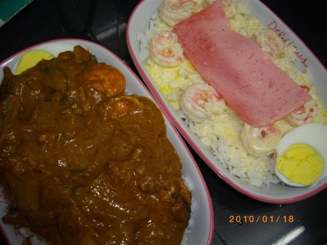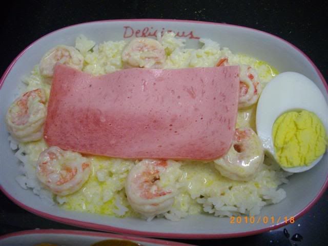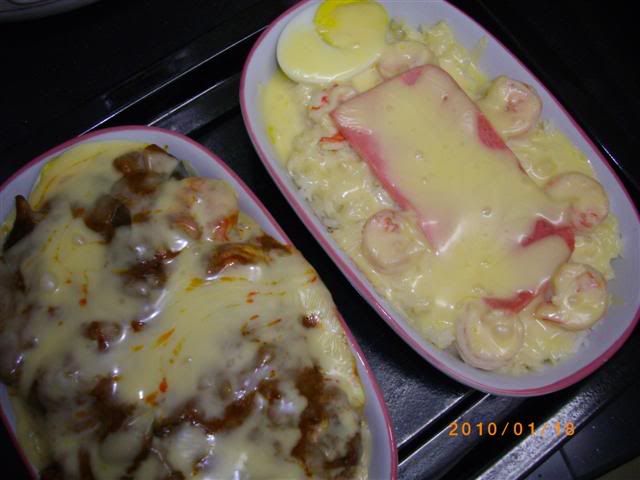 冰箱还有剩的咖喱鸡~我发热气,不能吃,就做一盘给宝贝吃就好~我自己呢就做另一种,奶油芝士焗饭~奶油的酱汁做法就和我做奶油芝士意粉一样,材料用了虾仁、半片火腿和半个蛋~说真的,吃起来,味道有像金加利的哦~哈哈~