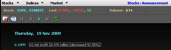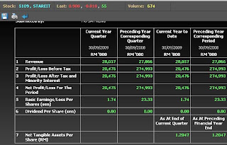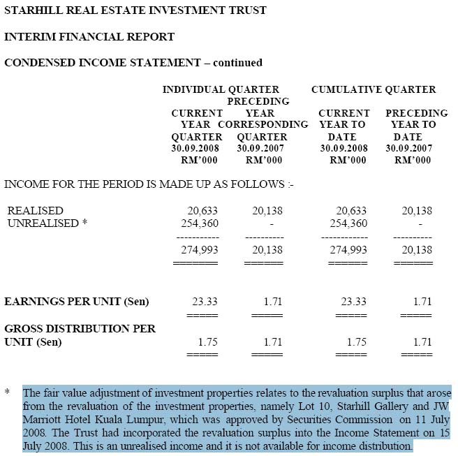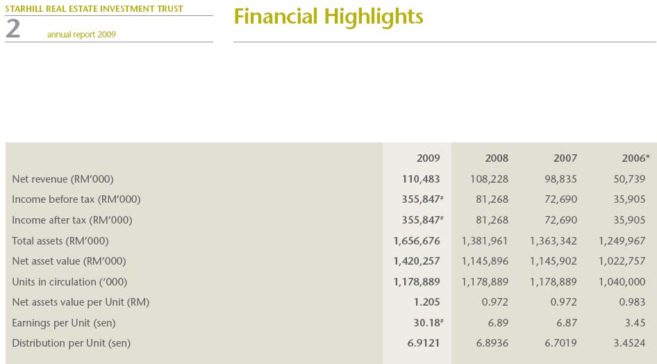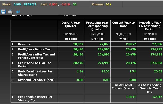 STARHILL REAL ESTATE INVESTMENT TRUST - 30/9/2009 Financial Sumarry Study一早给星洲财经的YTL业绩相关报道吓了一大跳, 什么STAREIT的最新一季盈利由多少亿大跌到几千万...