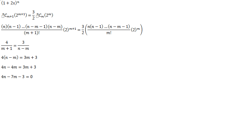 1.Let m and n be positive integers, where m <=n. If the expansion of ( 1 + 2x)^n thr coefficient of x^(m+1) is 3/2 times the coefficient of x^m, show that and n satisfy 4n - 7m - 3 =0
