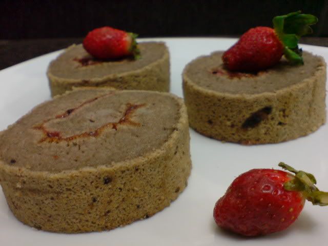 巧克力蛋糕卷卷到很漂亮哦...可是哦想问问看,配蓝莓酱会很好吃吗?因为从来没这么配过... |