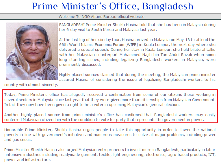 “Another highly placed source from prime minister’s office has confirmed that Bangladeshi workers may easily conferred Malaysian citizenship with the condition to vote for party that represents the government in power,” the website said.