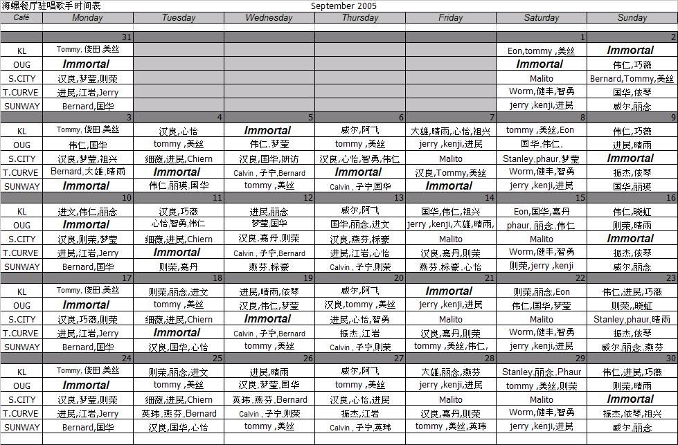 想请问这个礼拜三晚上(21/9/2005)在pyramid的驻唱歌手是谁? |