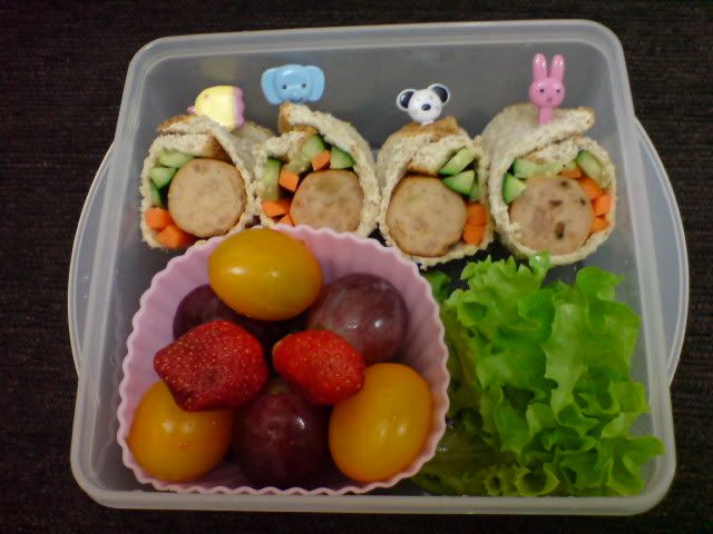 又是一个可爱的便当,面包卷一口放一个,还真的容易吃下。 |