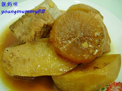用的是排骨,就照平时的焖肉煮法,只是加入白萝卜跟马铃薯