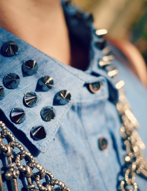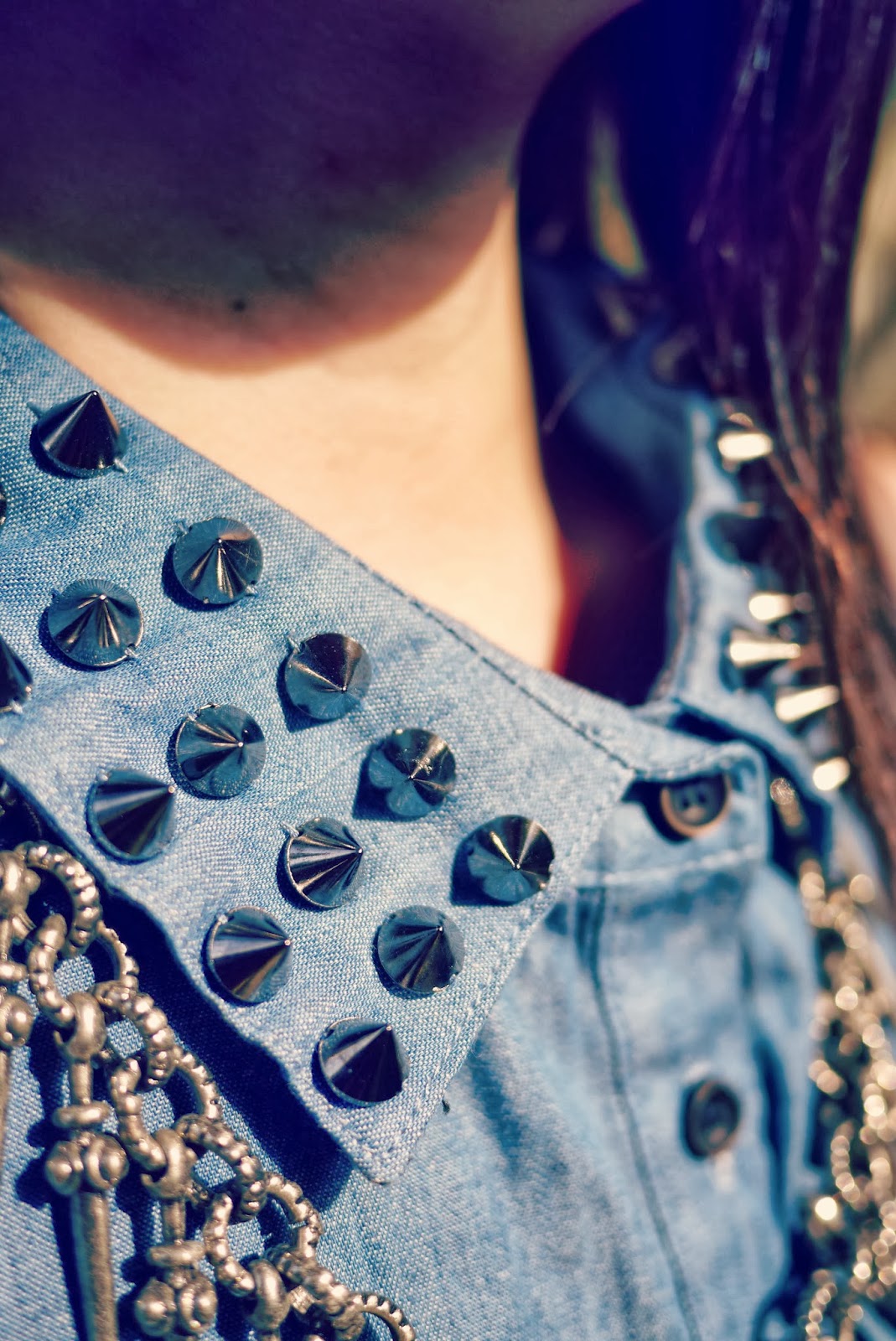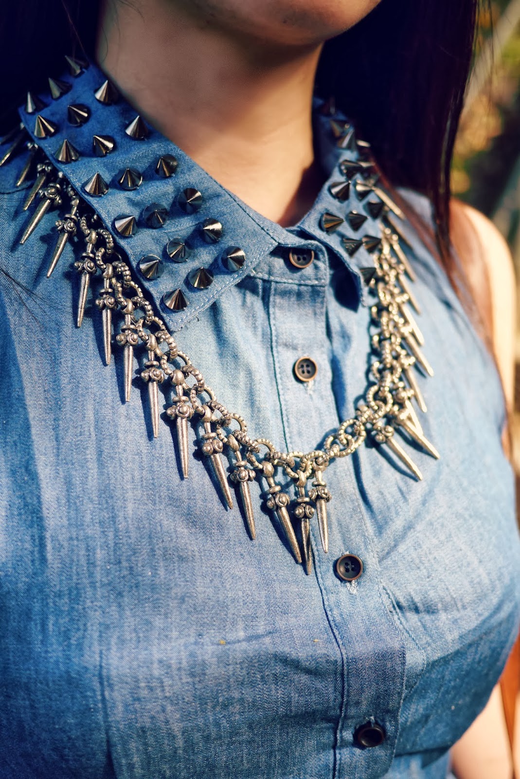 牛仔裙的特别之处在于领子处的柳钉设计,