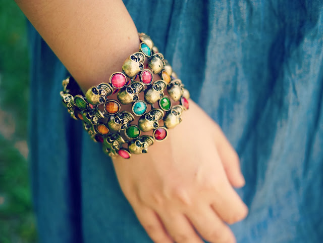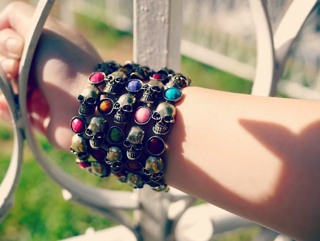 手镯我搭配了骷髏款的,还有彩石点缀, 是整体装扮中比较有色彩的单品。