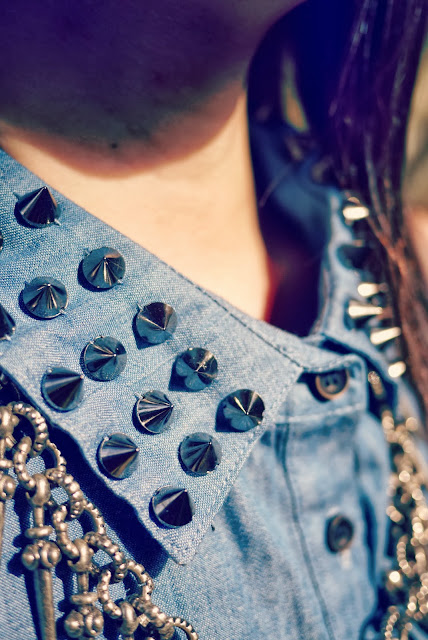 让简单的牛仔裙看起来有了些特色,带些庞克风的味道。