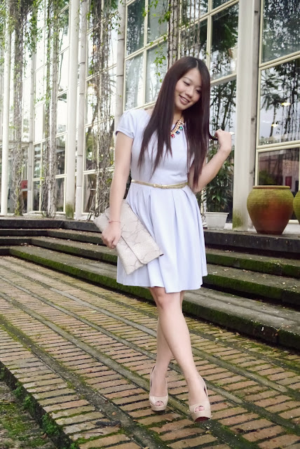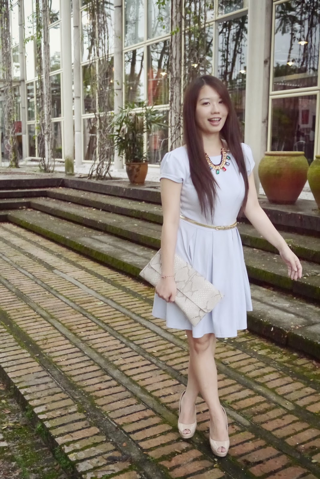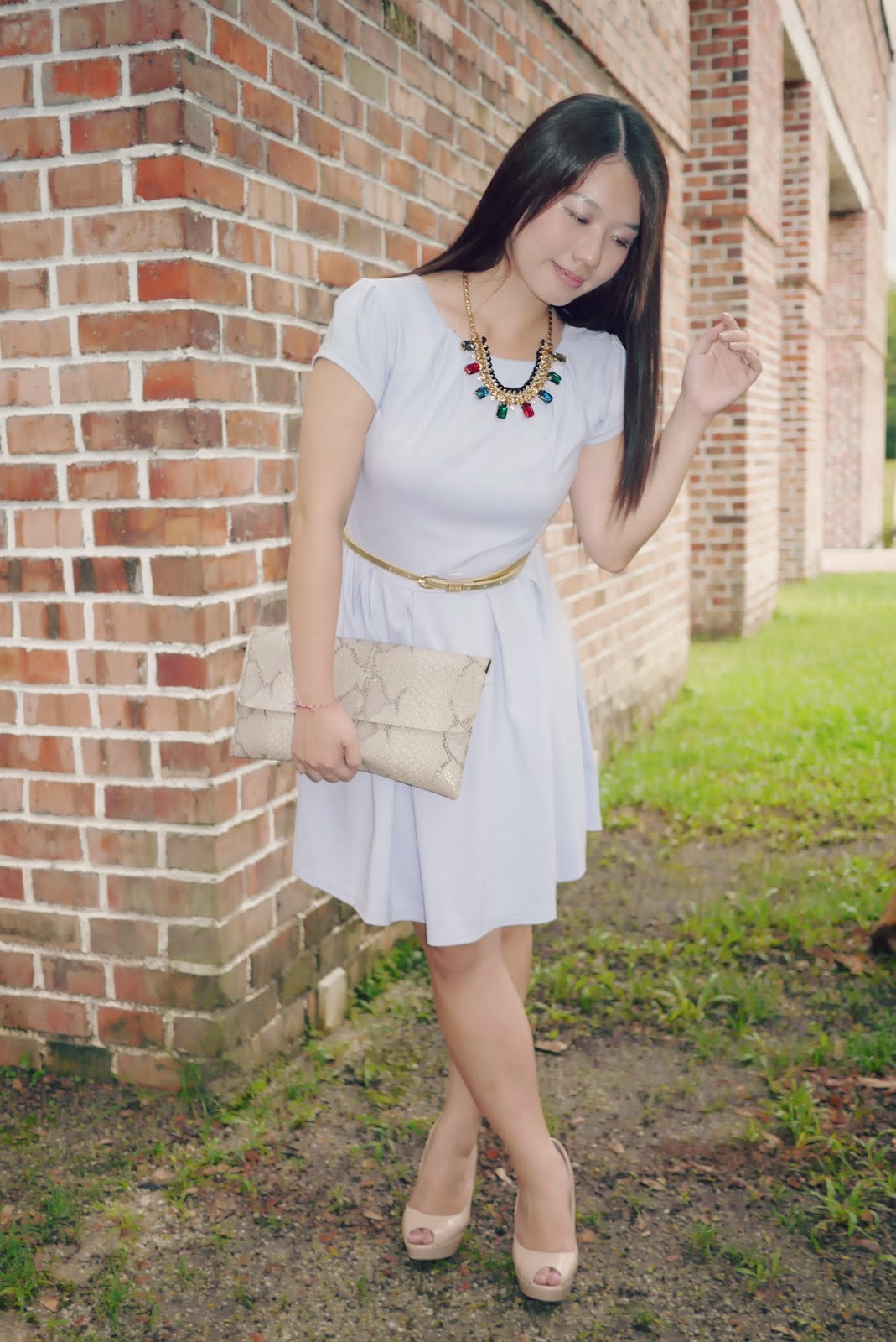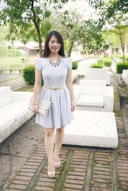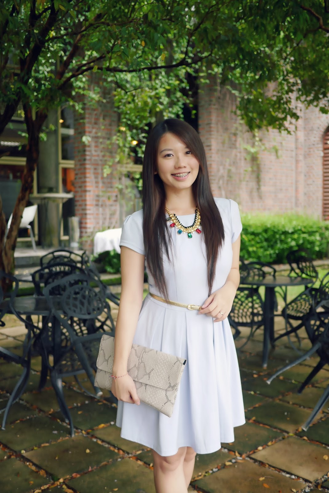 今次选择了粉蓝色的洋装搭配彩石项链,