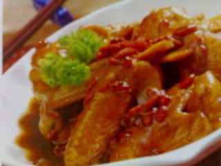 材料:枸杞1汤匙 .鸡翼4个 .水100毫升 .麻油3汤匙