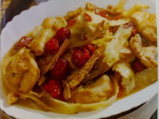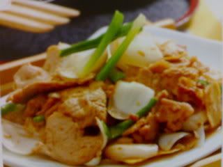 3)烧热2汤匙麻油爆香姜片后加入鸡肉兜抄片刻然后