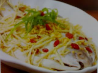 3)以大火蒸10分钟后淋上生抽 .铺上爆香姜丝和蒜茸即可 .