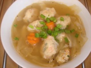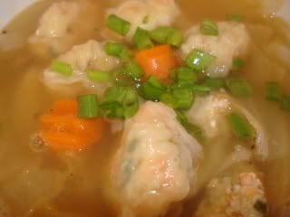 我用炒虾壳煮汤,然后加入猪骨汤,然后加上包菜。。。Mmmmmm。。。。。。汤甜又香!!