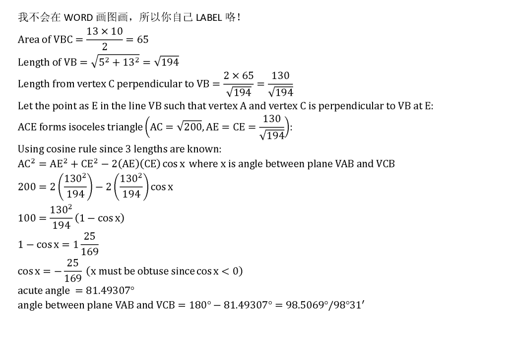 Find the angle between the plane VAB and VBC given that AB=10 cm and the height of the pyramid is 12 cm |