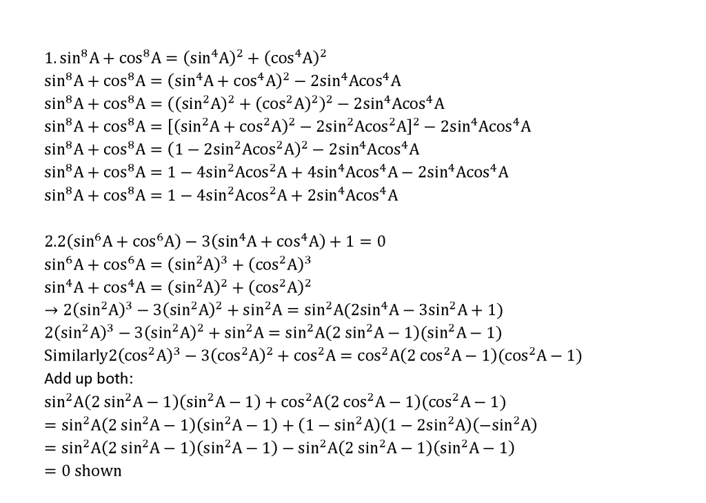 1. sin^8 A + cos^8 A = 1-4sin^2 Acos^2 A +2sin^4 Acos^4 A