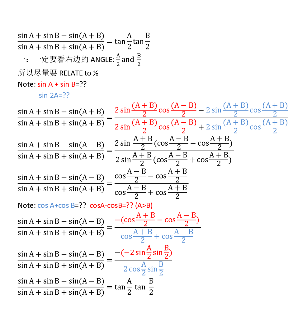 (sin A + sin B - sin ( A + B) ) / ( sin A + sin B + sin ( A + B) = tan(A/2)tan(B/2)