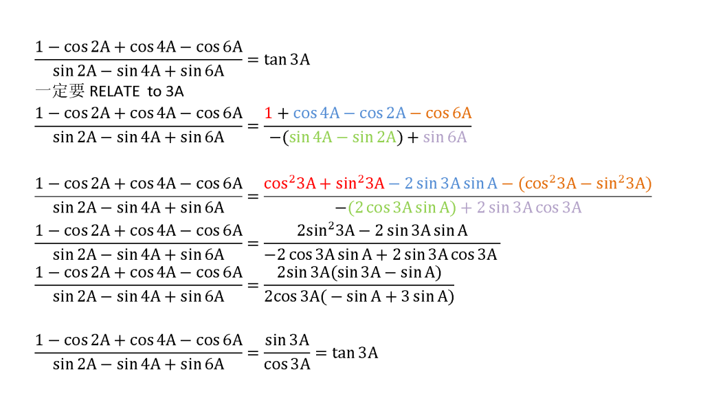 (1- cos 2A + cos 4A - cos 6A) / (sin 2A - sin4A + sin 6A) = tan 3A |