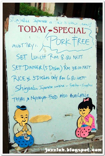 新宿有上下两层,楼上是塌塌米坐席,而楼下的是一般坐席,椅子清一色是藤椅,个人觉得没有日本feel反而有些些泰国或娘惹feel因为装饰品都是泰国饰品而且这里也有卖娘惹餐嘛。。。不相信日本餐厅卖泰国餐?看下面Today Special: