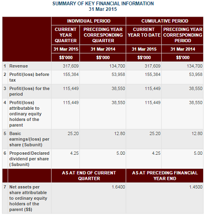 PERIOD | 31 Mar 2015 | 31 Mar 2014 | 31 Mar 2015 | 31 Mar 2014 | $$'000 | $$'000 | $$'000 | $$'000 |