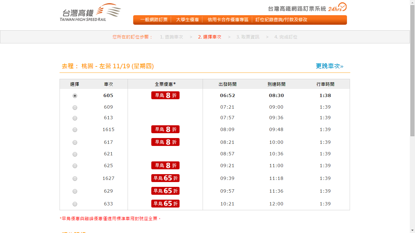 我的两个朋友分别在11月18 和11月13日到台,都买不到65折票。买到8折和九折票。我想桃园高铁出发,时段接近一些抵台的班机的话,会比较多人买。 |