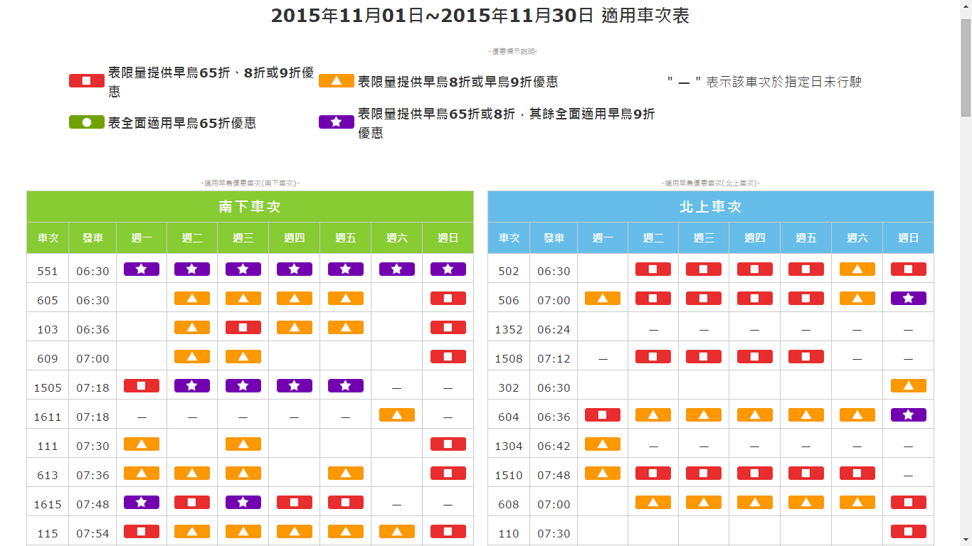 还有这样分的啊?!哎呀。我不知道,真谢谢你的分享。可是我不是很明白它的图表。它的时间是从第一站开始吗?我今晚又要买11月22日从台南去台中的票。还有想请问大大你知道桃园机场德士服务吗?我上网机场的网有看到那是24小时服务。我有订了19日6。52 的高铁票8折。想从机场直接德士去高铁站。可是我的台中包车司机说机场7点才有德士。。 |
