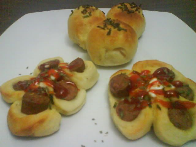 香肠葱香面包 香肠是大条的牛肉香肠,切一半 圆圆小小粒的那些没有包香肠,抹了牛油+葱碎+pasley碎