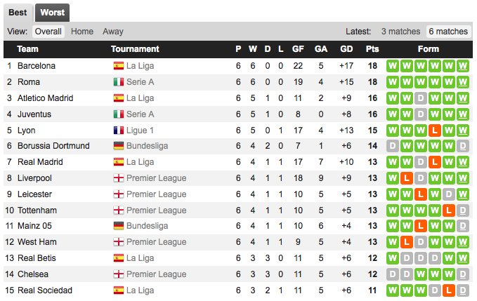 五大联赛近六轮状态排行榜:
