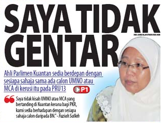 [Kenyataan YB Fuziah Salleh ini jelas sekali satu provokasi yang cukup menakutkan BN menjelang Pilihanraya Umum ke-13 akan datang pastinya. Malah, beliau dijangka akan menang selesa kali ini kerana majoriti masyarakat kaum Tionghua di parlimen Kuantan pasti akan menyokong pemimpin terbabit kerana isu Lynas. Ditambah lagi dengan pergolakan yang berlaku dalam BN sekarang tentang isu kerusi parlimen Kuantan yang khabarnya ingin diambil semula oleh UMNO pada PRU itu nanti. Jika ini berlaku, sudah pasti penyokong MCA akan berpaling tadah dan menyokong Fuziah nanti. Jika pada PRU12 jelas dapat dilihat kemenangan Fuziah dek kerana protes daripada pengundi Melayu terhadap calon MCA, Fu Ah Kiaw ketika itu. Kini segalanya ditangan rakyat Kuantan untuk menentukannya |