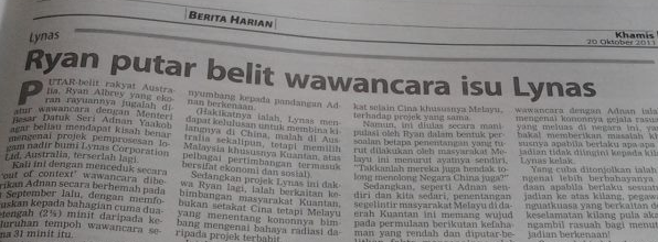 Dakwaan "Ryan Albrey" Pasal Lynas Terhadap MB Pahang "Di Bidas Dalam Berita Harian", Hari ini !!