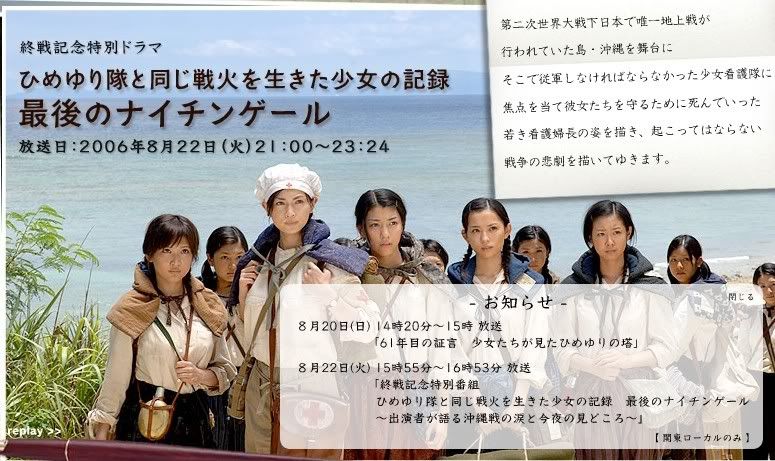 本片是以当初唯一一场把普通老百姓也卷入战地的冲绳岛作为背景舞台,根据当时亲身经历过那场战争的一位年长的老护士的回忆所改编而成的电视剧