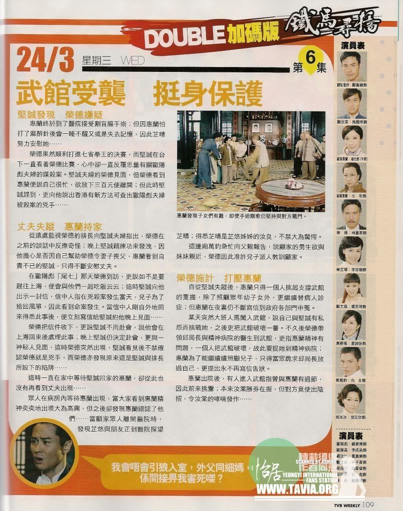 TVB近年极推崇这样坚强伟大的角色,但这是老一辈无线花旦们的专利,元秋的气质线条太江湖,文戏别扭,武戏痛快。郑嘉颖这次一人分饰两个角色,前面数集里一直是温和的父亲形象,问题不大,然后才是儿子顾汝章登场,角色暴躁粗鲁,有点一根筋,郑的演技,怕是又会把角色只驾驭在表面上;马国明起先的一派宗师风范,真有点吃不消,他还是鬼马幽默时候更温暖。