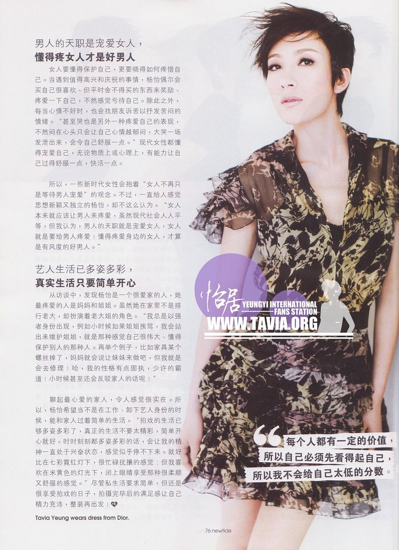 杨怡说她很喜欢「海宝」,一直都有留意它的消息:「我喜欢它造型可爱、线条简约,容易令人留下深刻印象,我曾看过一些报导说『海宝』的形态取自『人』字,蓝色是表达『四海之宝、海纳百川』的讯息,我觉得很有意思;我正在计划无论如何在半年展期结束前一定要去上海参观世博,届时我更会大量搜括『海宝』的纪念品,让我可重温曾踏足2010中国首办综合性上海世博会的盛事。」