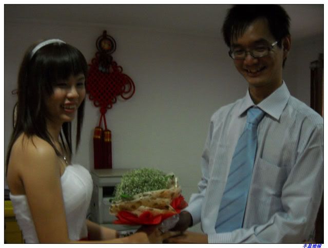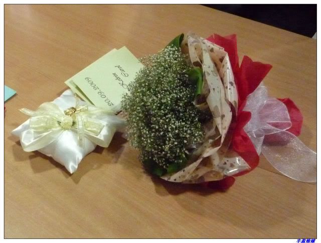 盈,你好美哦!礼服也是美美的,恭喜你哦!你的手花很特别,为什么会想到要用漫天星来做?