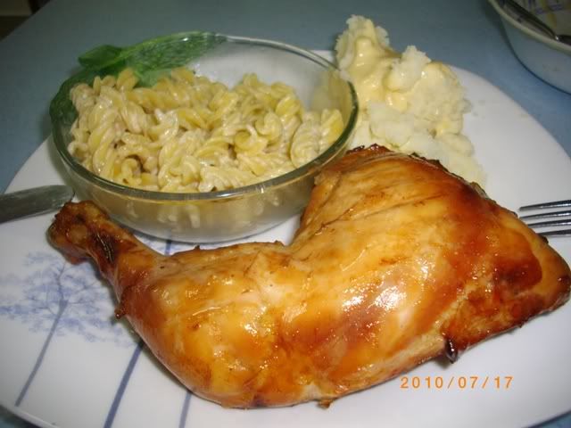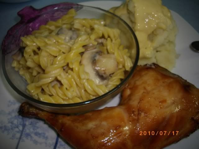 这次的晚餐很简单,鸡腿昨晚就腌了,只用现成的叉烧酱~然后烤熟即可~薯泥的功夫全交给宝贝,我只是调味~哈哈!至于意粉,我的那份加了新鲜蘑菇~炒方面也是他做~哈哈~很好吃的一餐~