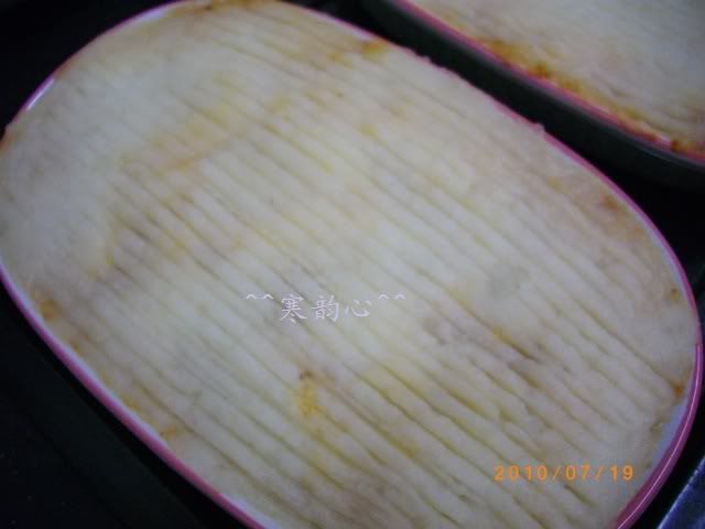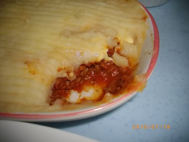 我选用牛肉碎,调味方面作了更改,而芝士我选择放在肉碎上,然后才铺上薯泥~我用的是tomato paste,不知道和Felicia的一样吗,不过我个人觉得,tomato paste的味道不够浓郁,最后我还加了点意大利酱才觉得够味,哈哈!