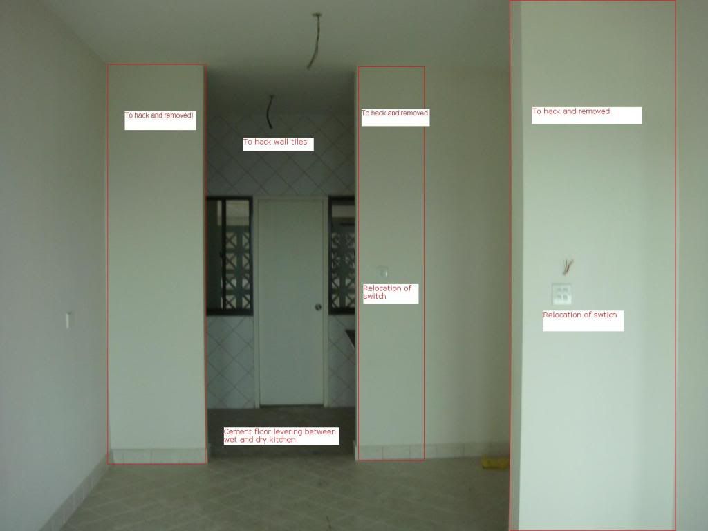 1。.Hack了廚房三幅牆, 你的廚房floor tiles要換到dry kitchen的diamond tiles那里?因为会hack到你的dining 13"x13" floor tiles.